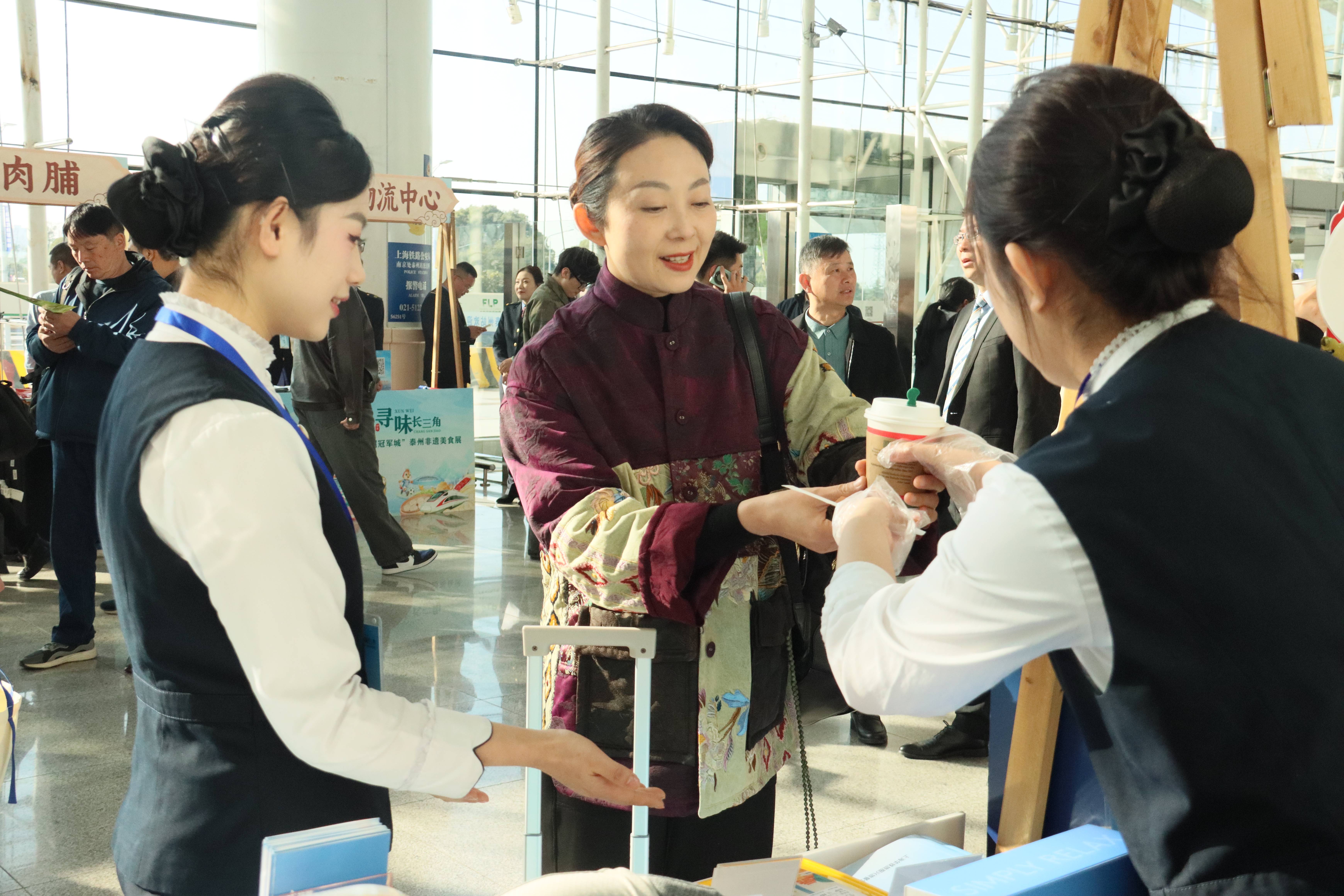 当天,在泰州站候车大厅,一场“美食盛宴”正在上演——泰州“早茶三宝”烫干丝、鱼汤面、蟹黄汤包,姜堰大炉烧饼,宣堡小馄饨,靖江肉脯……这是“我的铁路风景・寻味长三角”主题活动的第三站,由上铁集团联合泰州市文化广电和旅游局共同举办“乐游苏超冠军城”泰州非遗美食展,集结10余家泰州老字号品牌和高铁美食,打造高铁出行新体验。