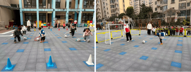 运动环节将活动氛围推向高潮,孩子们伴随着欢快的音乐跳起足球操,踢、传、摆臂等动作整齐划一,稚嫩的脸庞上满是朝气与活力。定点射门游戏中,小选手们瞄准球门奋力一踢,欢呼声与喝彩声此起彼伏;足球赶小猪趣味项目里,大家手持球杆操控足球绕过障碍,在奔跑与协作中体验运动的快乐。