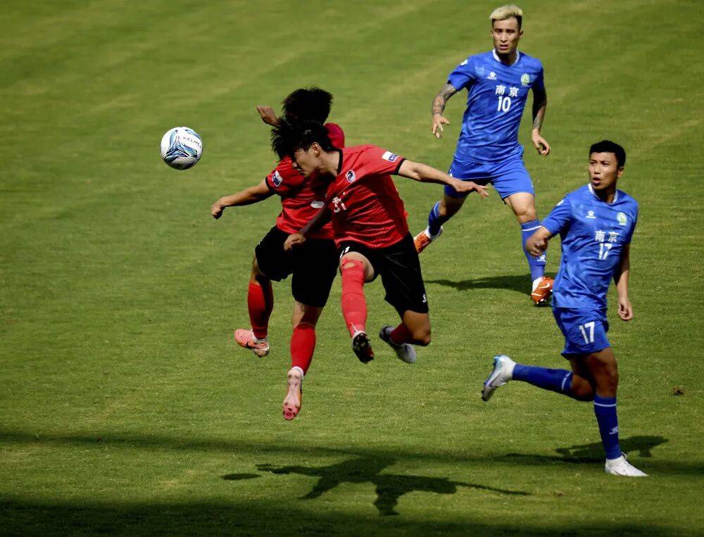 △ 6月14日,球员在“苏超”淮安队对阵南京队的比赛中拼抢。新华社发(曹政 摄)