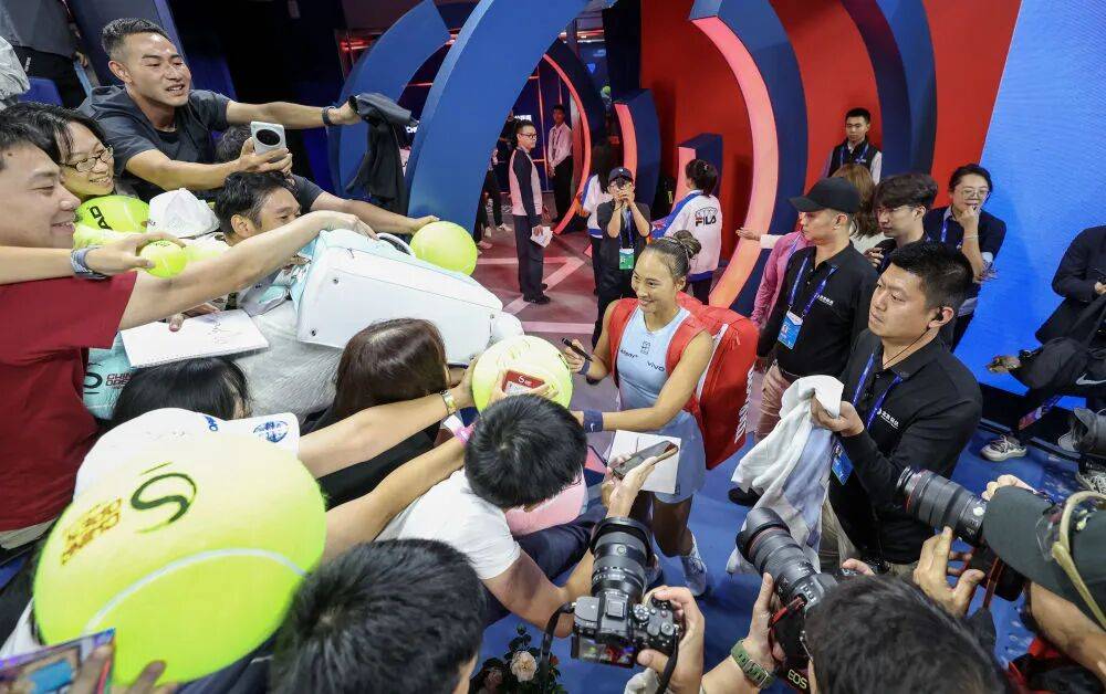 △ 9月27日,在北京举行的2025中国网球公开赛女单第二轮与哥伦比亚选手阿朗戈的比赛后,中国选手郑钦文(中)与观众互动。新华社记者 白雪飞 摄