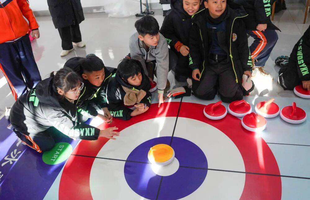 △ 12月3日,吉林市松江东路小学校学生在吉林市纳美山谷度假区体验旱地冰壶。新华社记者 颜麟蕴 摄
