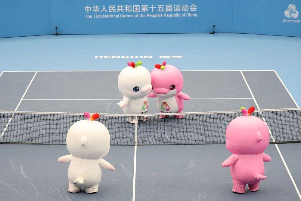 △ 11月12日,第十五届全国运动会吉祥物“喜洋洋”“乐融融”在网球比赛间隙表演。新华社记者 张晨霖 摄