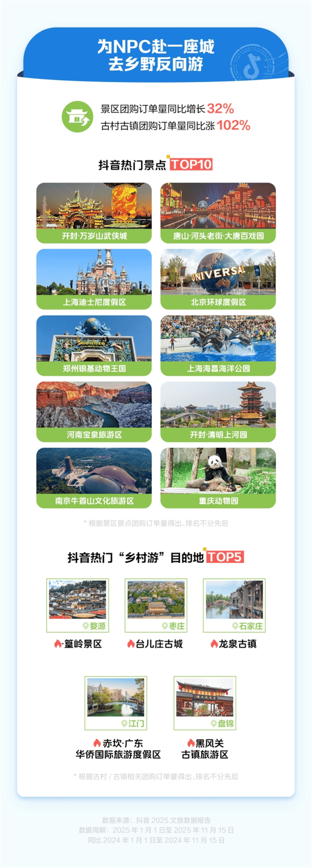 从订单消费看,上海、北京、南京、成都、杭州等入围十大热门旅游城市,洛阳、湖州、秦皇岛、开封、徐州等入围十大热门宝藏城市。抖音景区团购订单量同比增长32%,“NPC游”、“IP游”持续出圈,南京牛首山文化旅游区、万岁山武侠城、河头老街·大唐百戏园、上海迪士尼度假区、北京环球度假区、郑州银基动物王国、上海海昌海洋公园、河南宝泉旅游区、清明上河园、重庆动物园成为十大热门景点。
