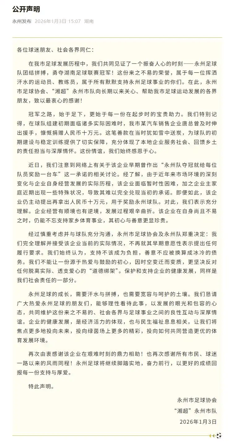1月3日,永州市足球协会、“湘超”永州市队发布声明称,完全理解并接受该企业当前的实际情况,不再就其早期意愿性表示提出任何履行要求,“我们始终认为,支持不该成为负担,善意不应被换算成冰冷的债务。”