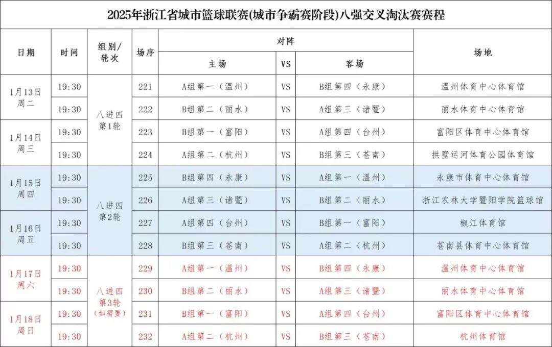 八强赛采取三局两胜制,将从1月13日持续至1月18日(如需要)。八强赛具体对阵为——温州vs永康、丽水vs诸暨、富阳vs台州、杭州vs苍南。