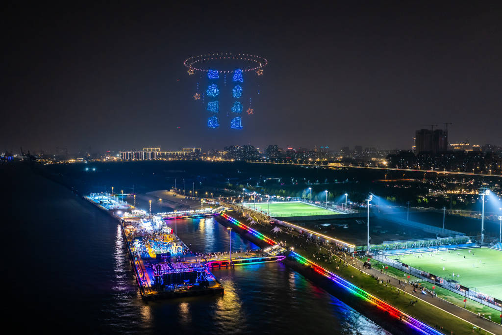 夜幕降临,千架无人机在滨江上空组成各种图案,时而化作南通地标建筑,时而呈现祝福字样,梦幻光影点亮了整个滨江夜空。记者漫步滨江岸线,看到不少游客欣赏着江景,享受着难得的悠闲时光。从上海来的张天帅一家正坐在折叠椅上喝着精酿啤酒,看着江面上往来的船只,“我们是第一次来南通,这里的滨江太美了,既有科技感的活动,又有自然唯美的江景,很适合全家出游。”