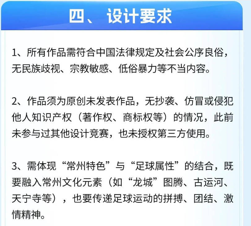 常州队的征集也与扬州队类似,涉及队徽、队服和队歌。常州对于设计的要求包括原创性,并需展现“常州特色”与足球属性的结合。设计需融入常州的文化元素,如“龙城”图腾、古运河、天宁寺等,同时传达足球的拼搏、团结与激情精神。