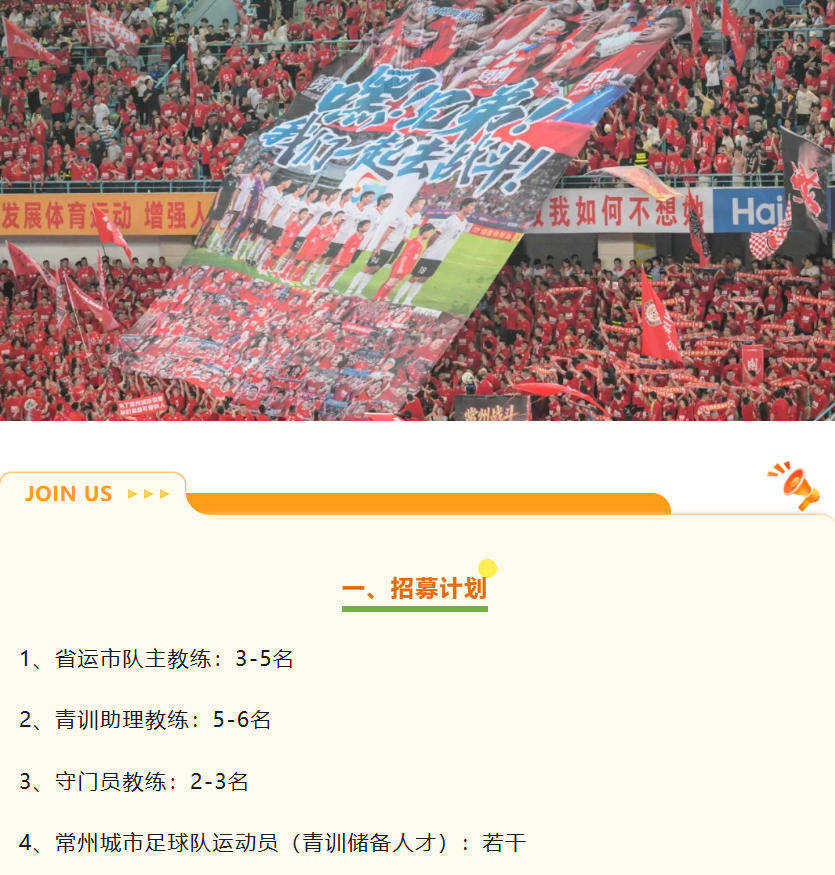 在队徽、队歌、队服、吉祥物等元素的征集之外,各支球队也开始了人员的招募工作,为2026年的苏超做充分准备。连云港队已面向全市公开选拔足球运动员,要求报名者必须是1986至2008年出生的男性,且符合一定的户籍或学籍要求,此外,现役职业队员也在招募之列。连云港队不仅招募运动员,还在寻找主教练。而常州市队则招聘了多名足球相关职位,包括省运市队主教练(3-5名)、青训助理教练(5-6名)、守门员教练(2-3名)以及青训储备人才。
